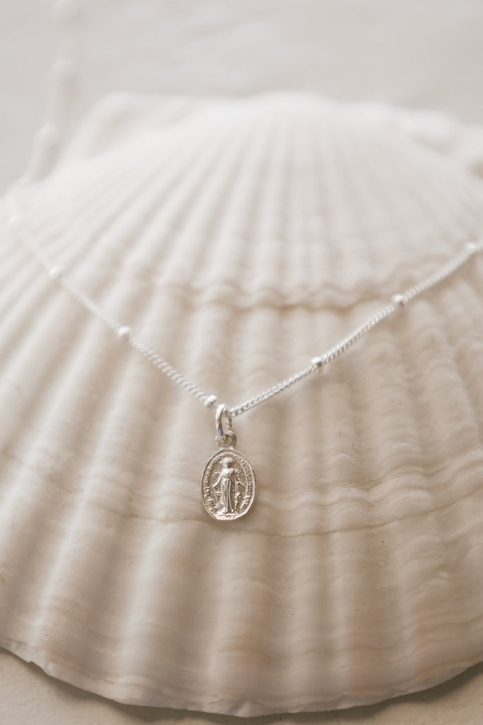 The Miraculous Medal given to St Catherine Laboure from Our Lady who promised all who wear this image will receive great graces. The front of the medal stands on a globe crushing the head of the serpent symbolizing her role as the new Eve. The back of the medal with an "M" below a cross where Mary stands firm at the foot with all of us who worship her Son, Our Lord.