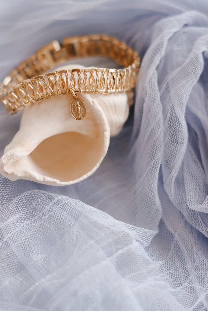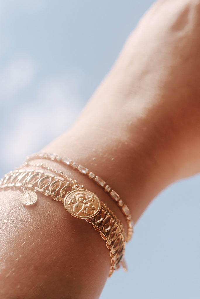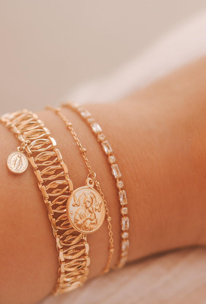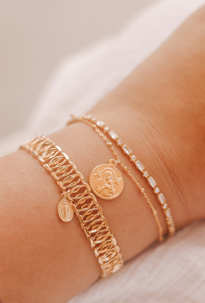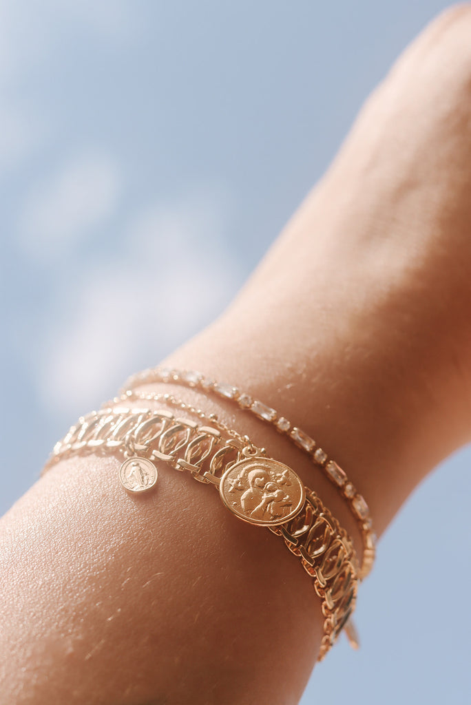 Introducing the Lace Miraculous Medal Bracelet, a luxurious statement piece for your spiritual journey. Crafted in 18K gold-filled material, this bracelet features a stunning double Cuban link chain design, exuding sophistication and exclusivity. A delicate Miraculous Medal honors Our Lady's grace, making it a perfect blend of faith and style for daily devotion or special occasions.