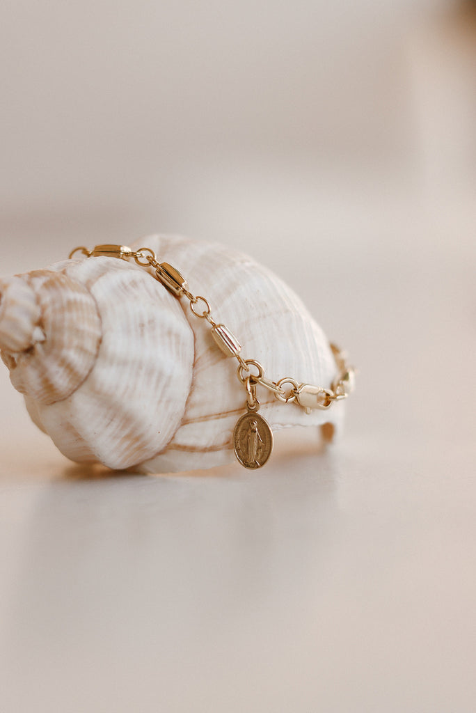 Celebrate your devotion with the stunning Opal Miraculous Medal Bracelet, a harmonious blend of faith and beauty. Crafted with care, this bracelet features shimmering opal stones paired with 18K gold-filled links, creating a delicate and timeless design. The centerpiece is a 14K gold vermeil Miraculous Medal with a sterling silver base, showcasing the Blessed Virgin Mary in stunning detail. Ideal for daily wear or as a meaningful gift for baptisms, confirmations, or special occasions, this bracelet is a beautiful reminder of faith and grace.