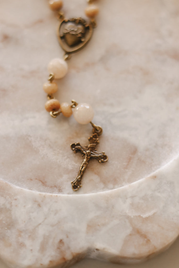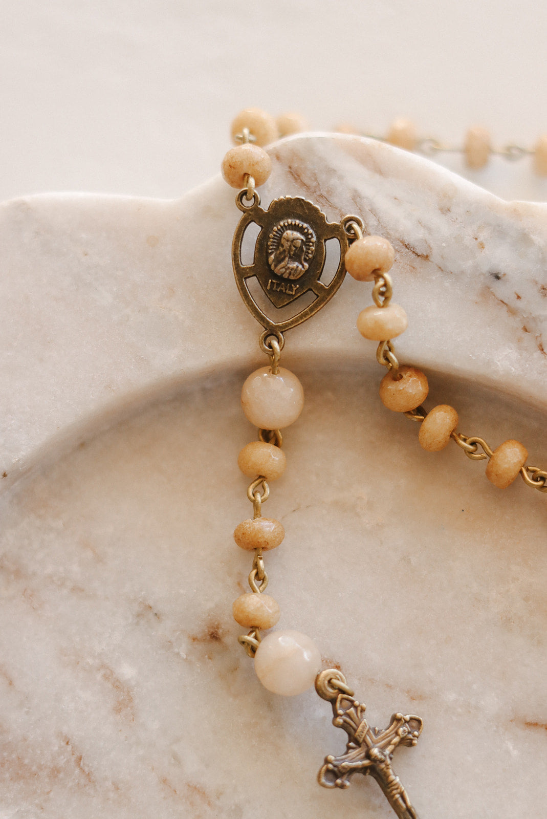 - Centerpiece & Crucifix: The Sacred Heart centerpiece, crafted from polished brass, and a matching brass crucifix add a warm, elegant touch to the rosary. Both items are made in Italy.