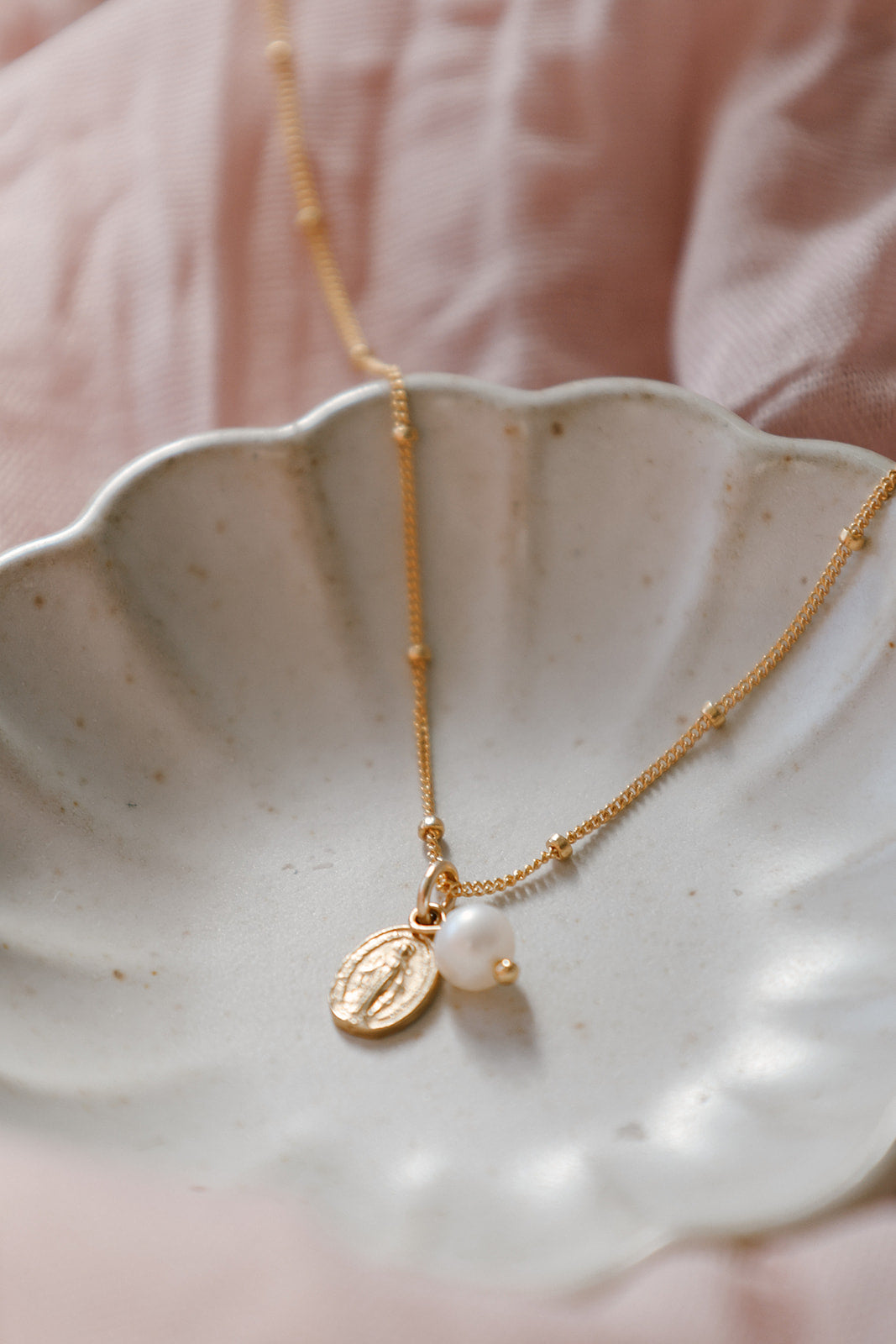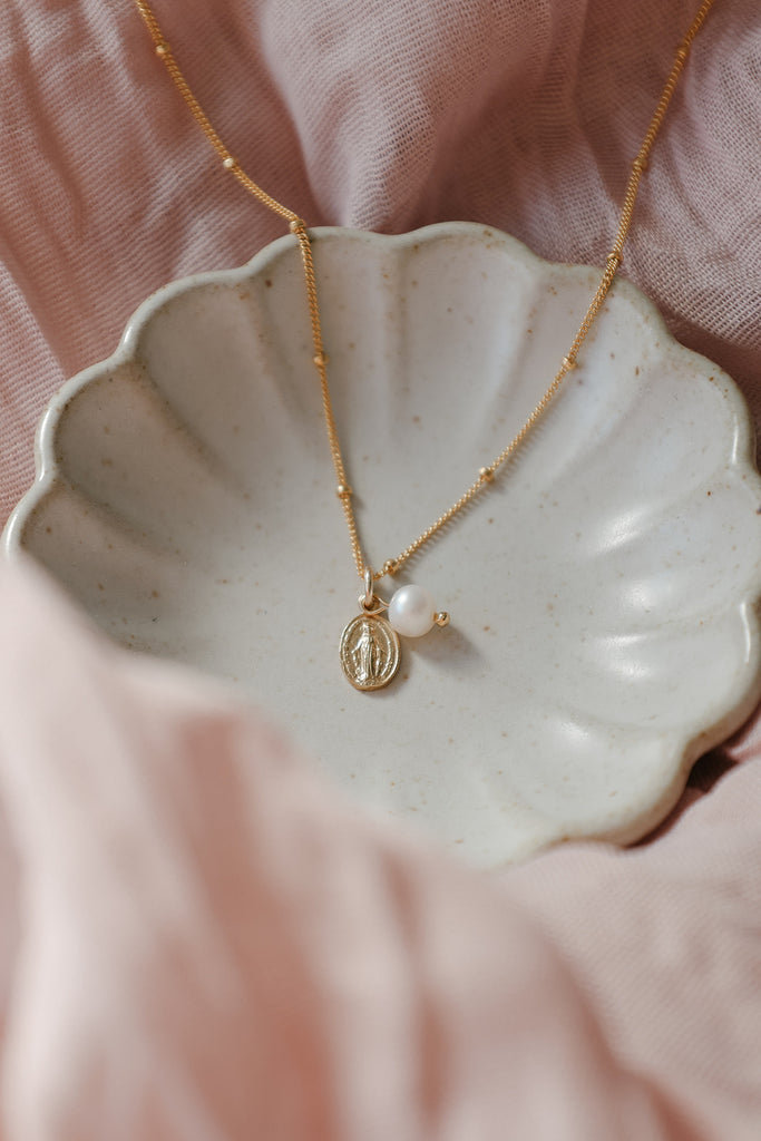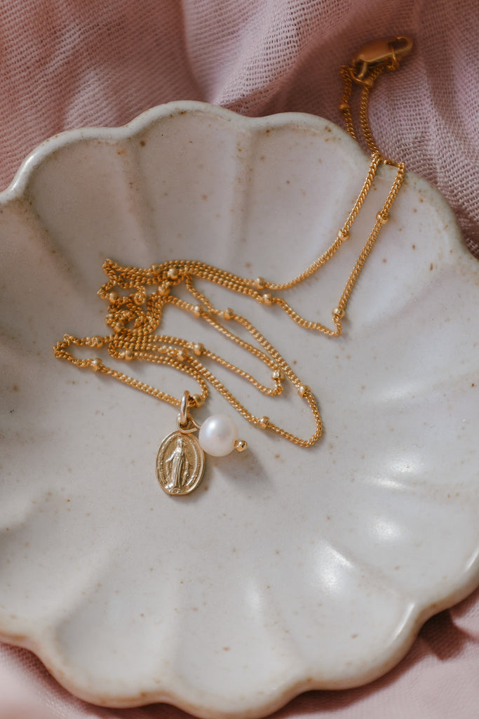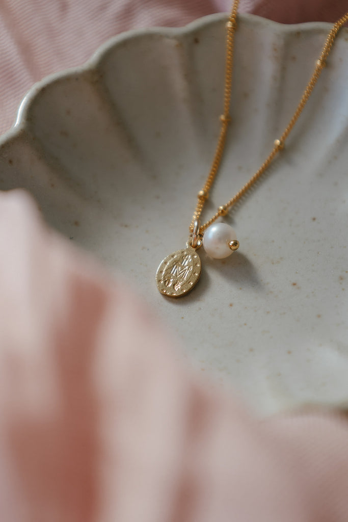 Miraculous Medal & Pearl Necklace, a stunning combination of divine symbolism and natural elegance.