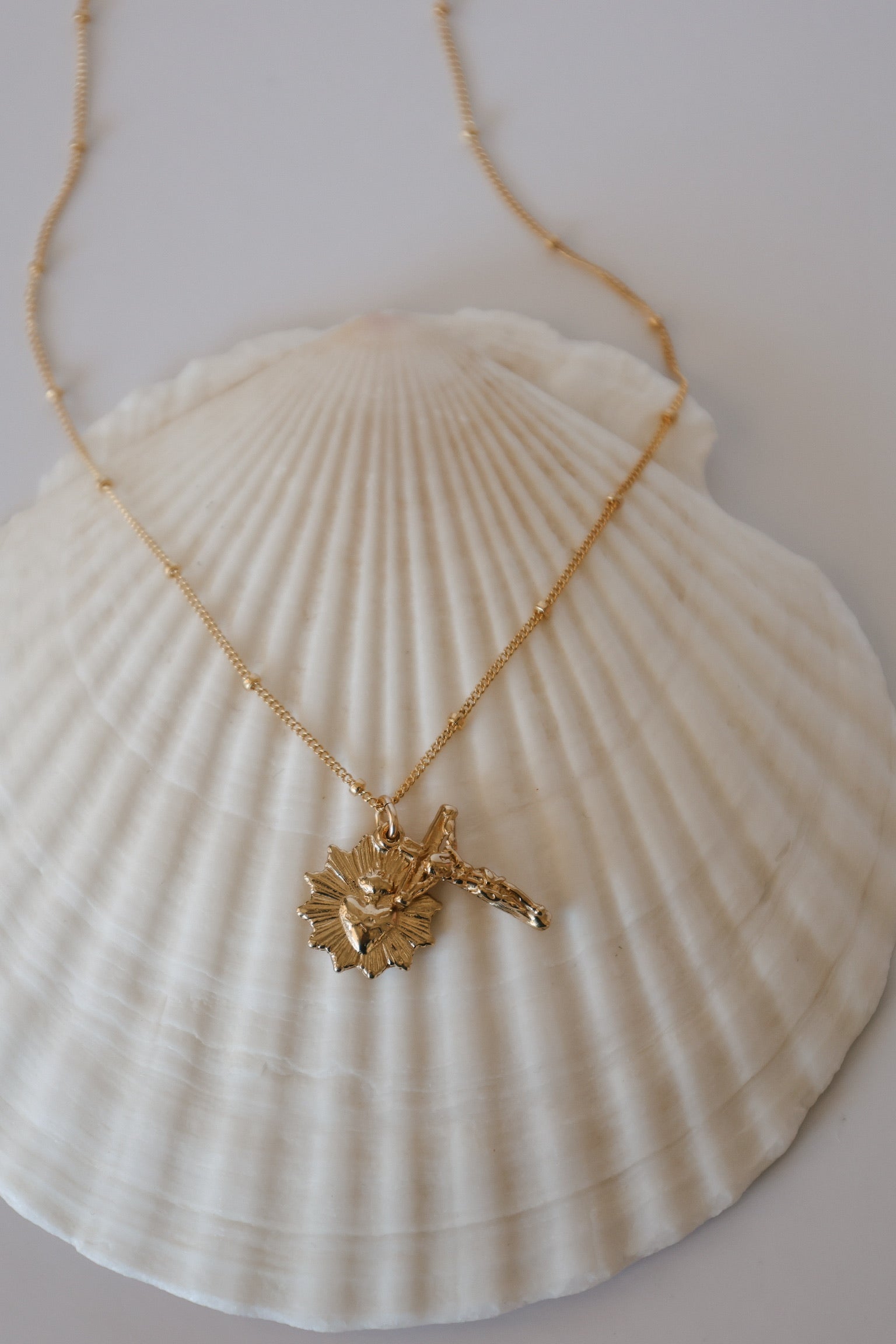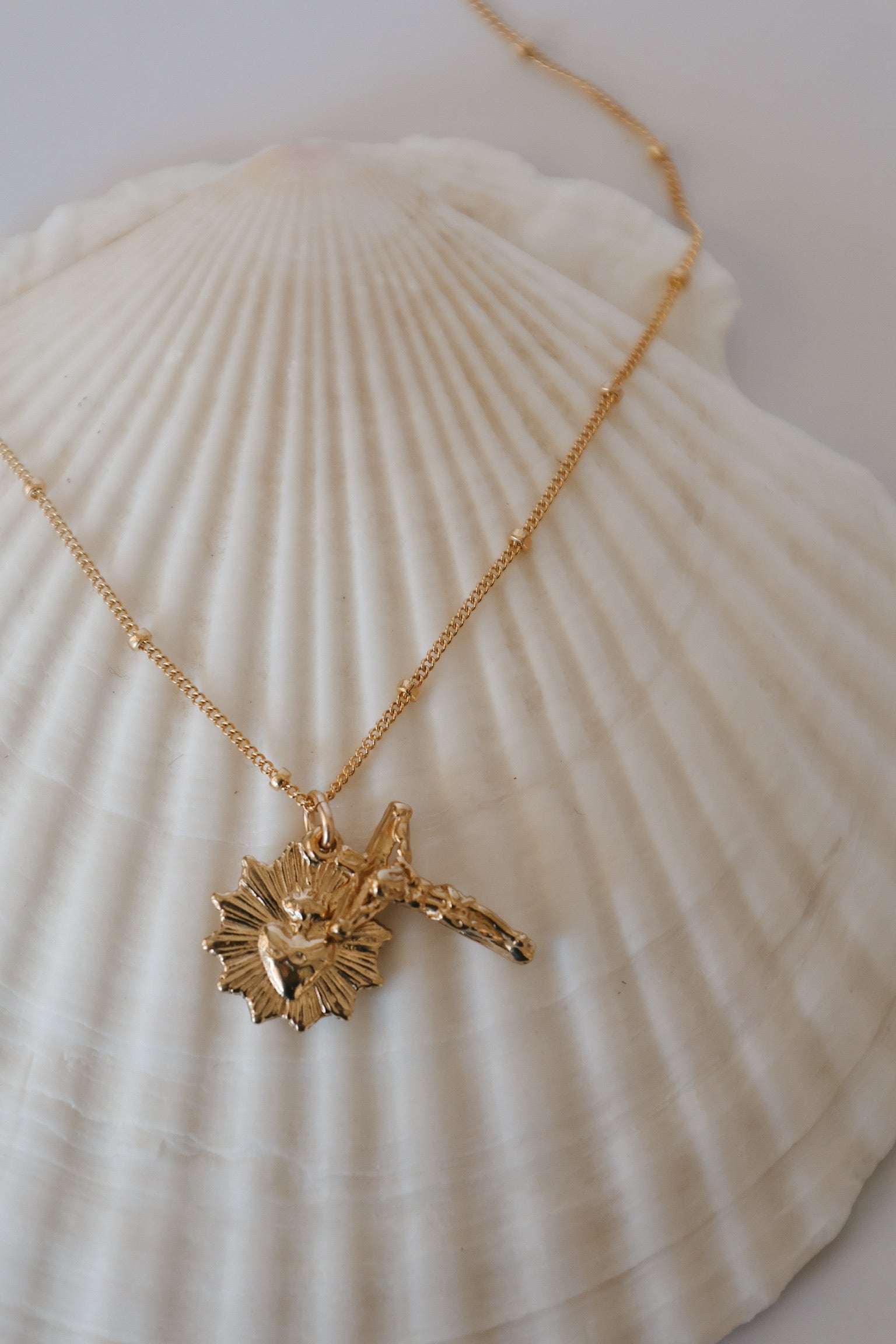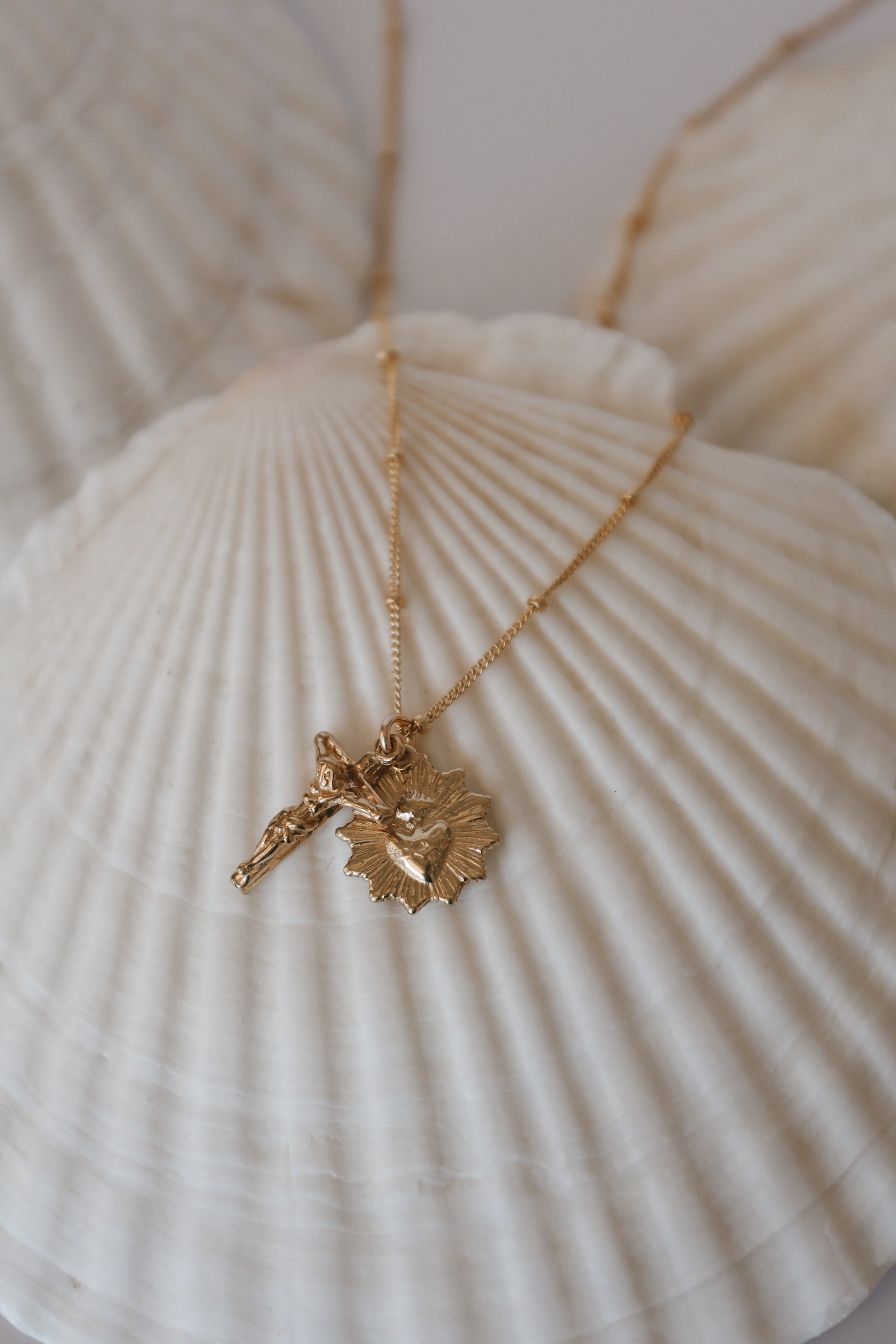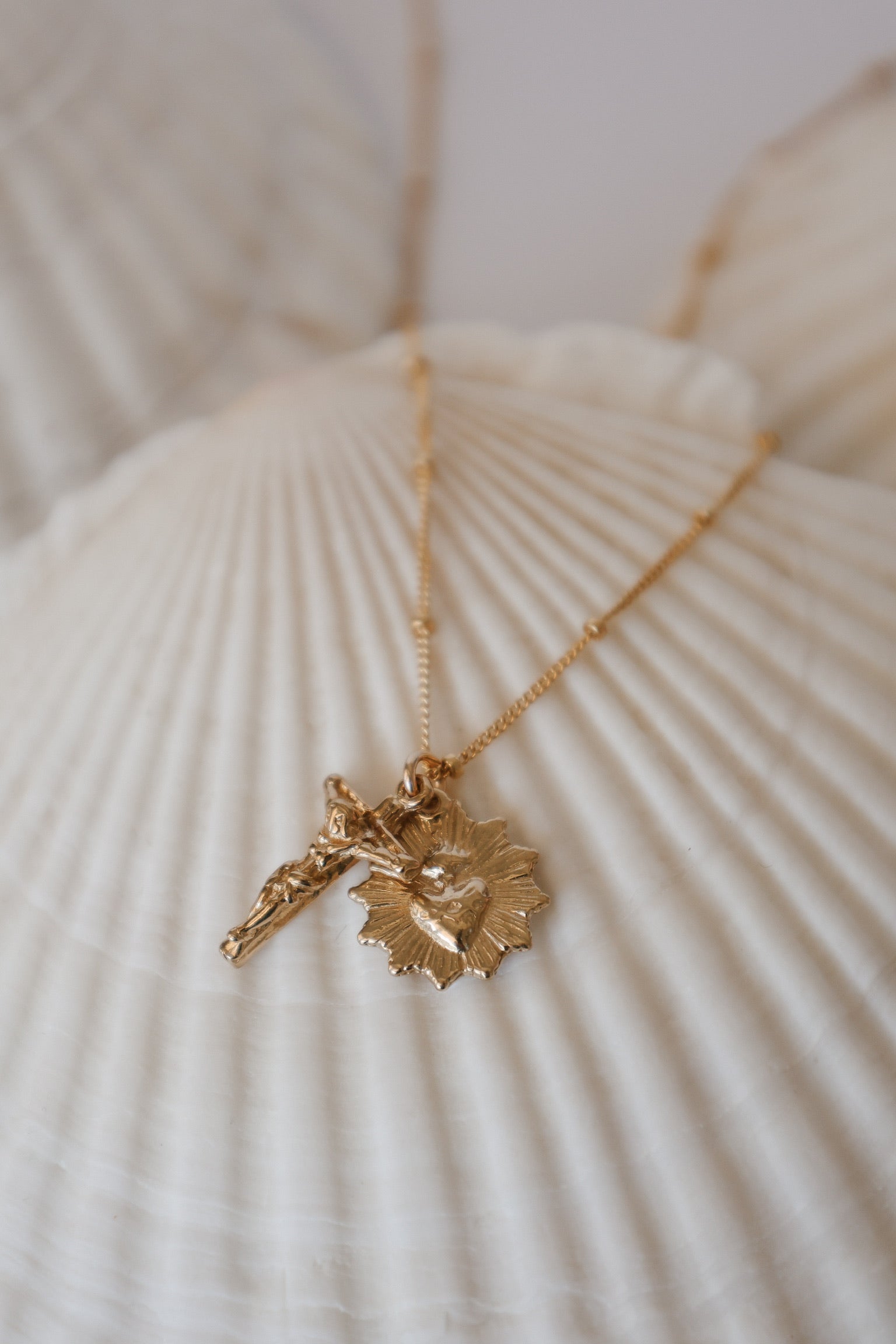 This elegant necklace, cast in sterling silver and 14k gold-plated vermeil, pairs the Sacred Heart with a delicate Crucifix, creating a profound visual testament to divine love and sacrifice. The central medallion depicts the flaming heart a representation of an enduring, burning love for humanity, while the accompanying Crucifix serves as a quiet, daily reminder of faith and protection.