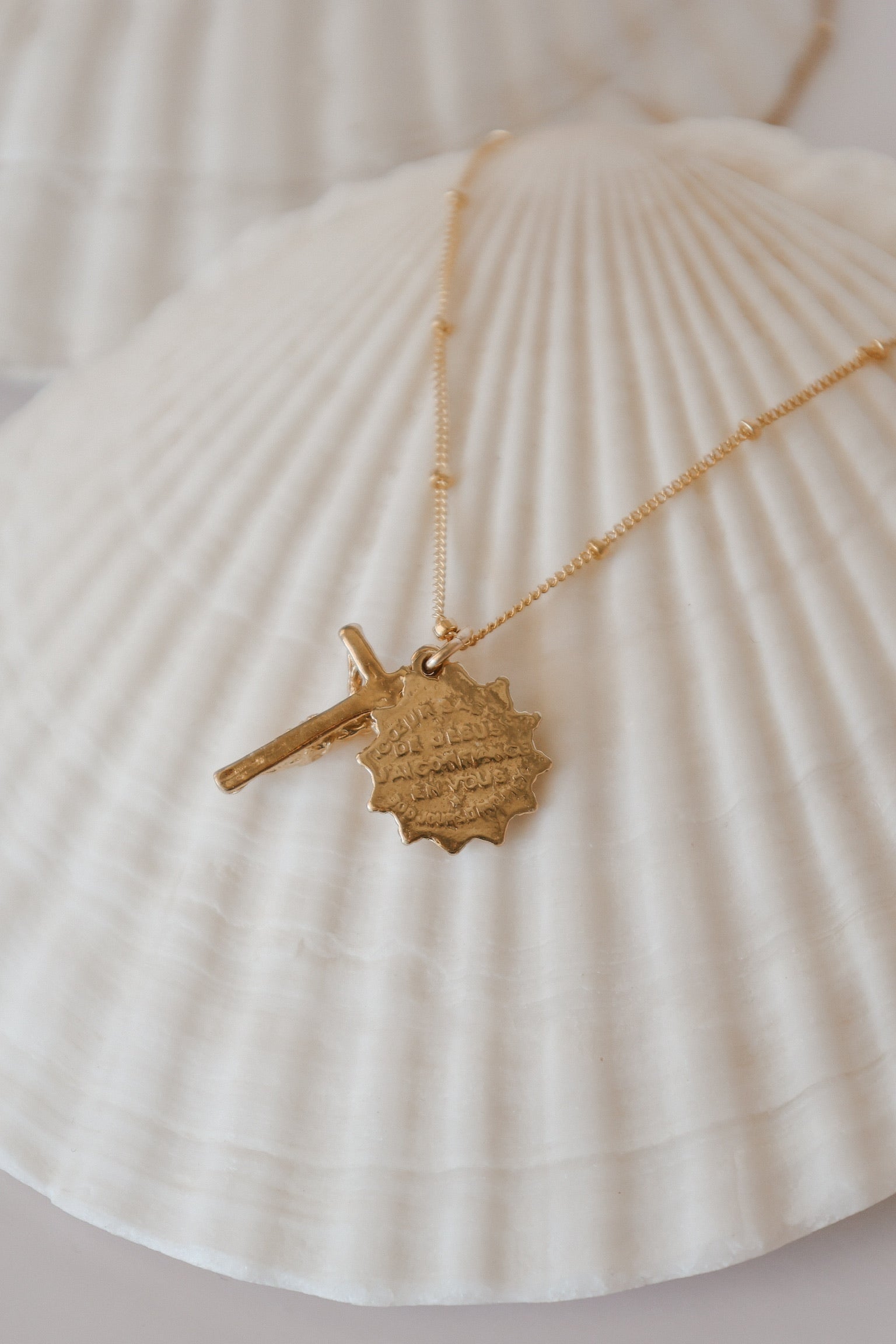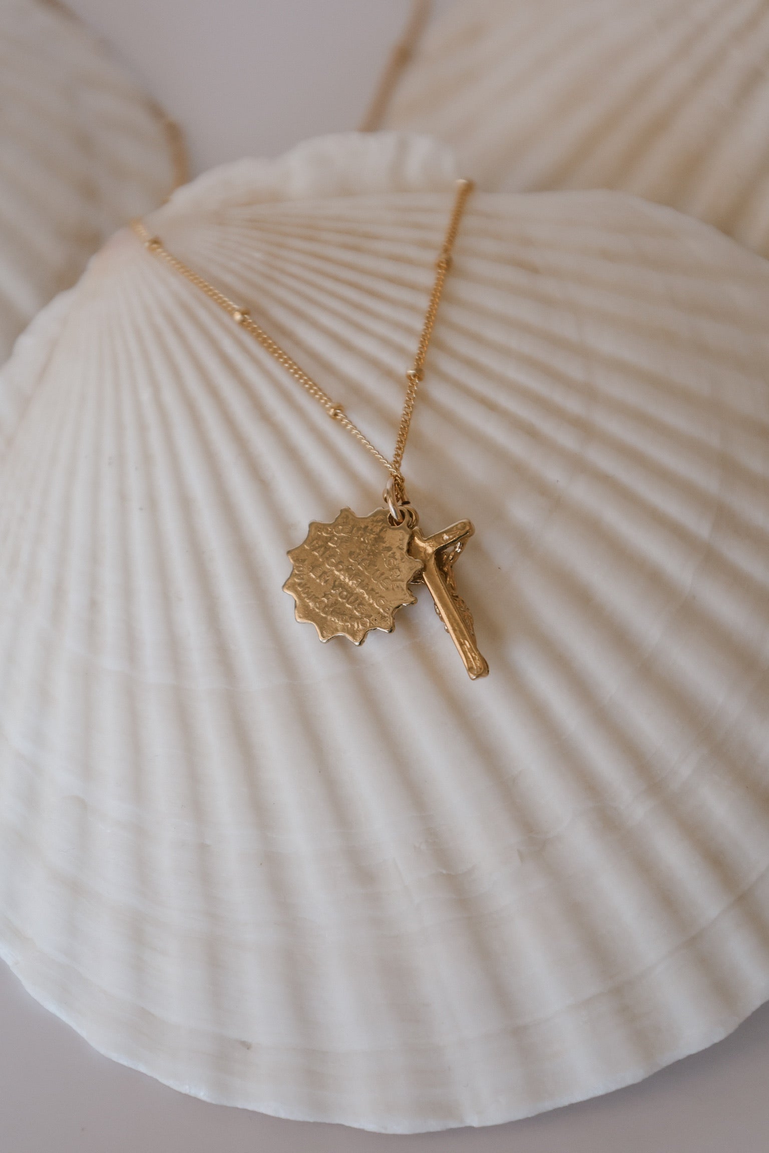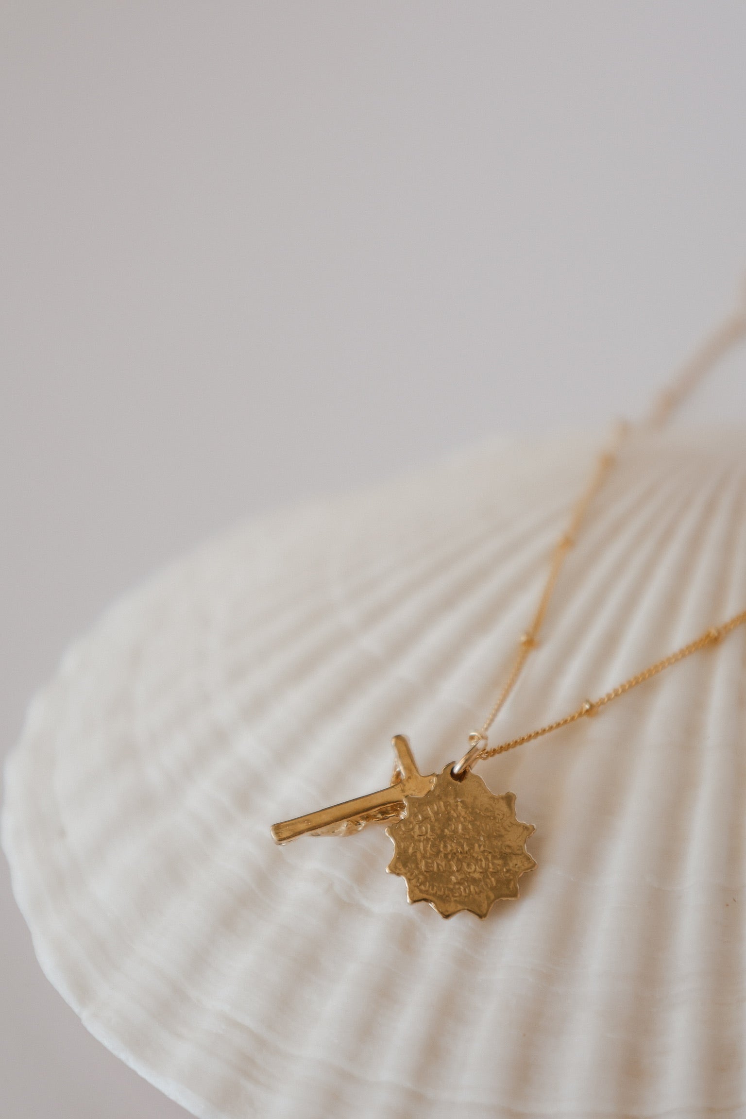 Each piece is thoughtfully handcrafted with an organic, molten texture that feels both ancient and modern. Suspended from a dainty chain, this necklace is designed to be worn close to the heart, offering a sense of grace and peace to the wearer. Whether layered with other treasures or worn as a singular statement of belief, it is a beautiful companion for life’s spiritual journey.