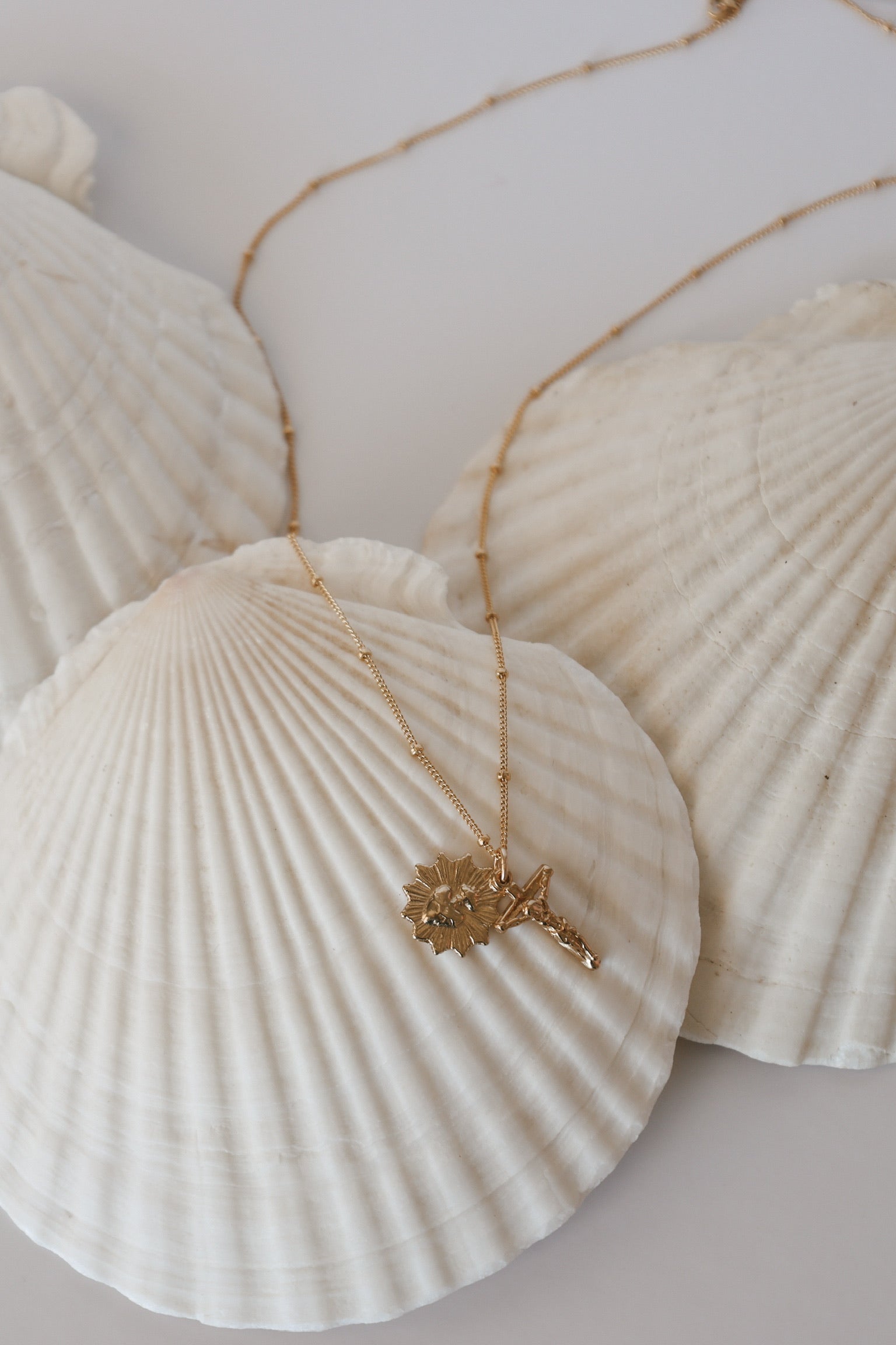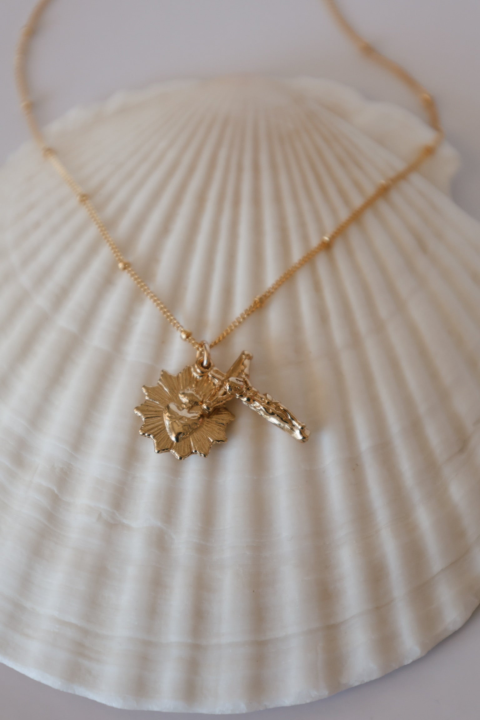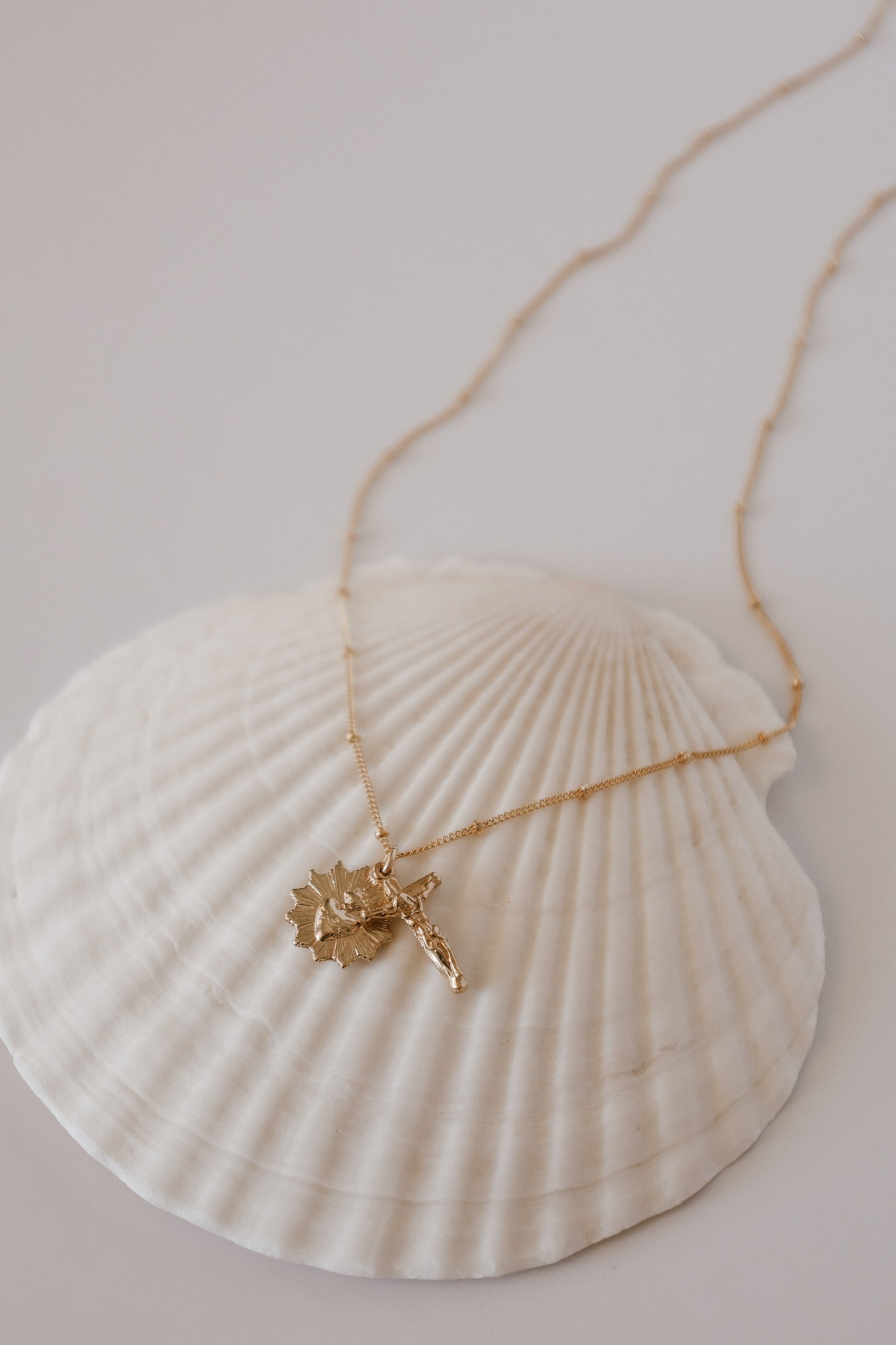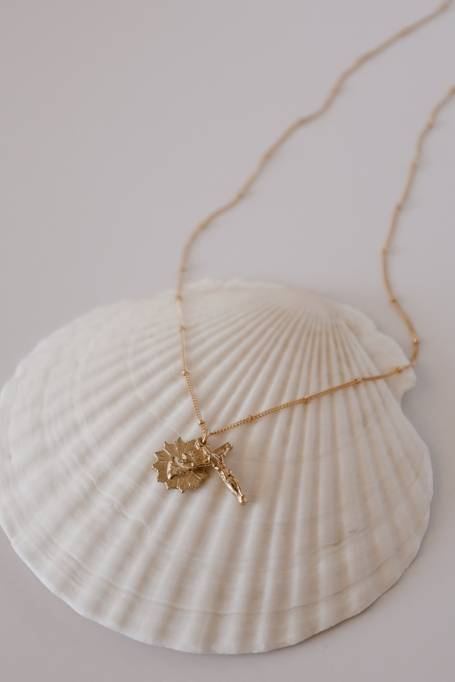 Each piece is thoughtfully handcrafted with an organic, molten texture that feels both ancient and modern. Suspended from a dainty chain, this necklace is designed to be worn close to the heart, offering a sense of grace and peace to the wearer. Whether layered with other treasures or worn as a singular statement of belief, it is a beautiful companion for life’s spiritual journey.